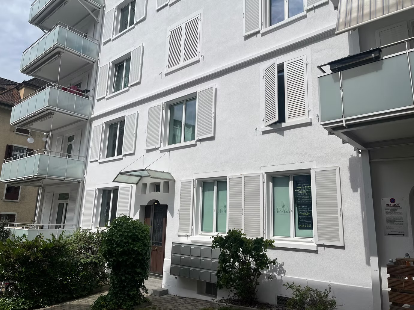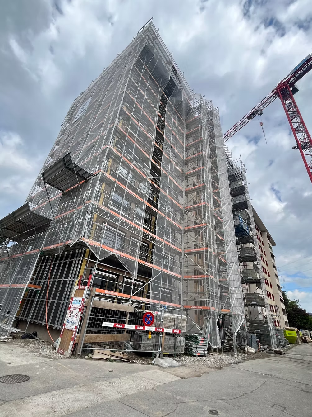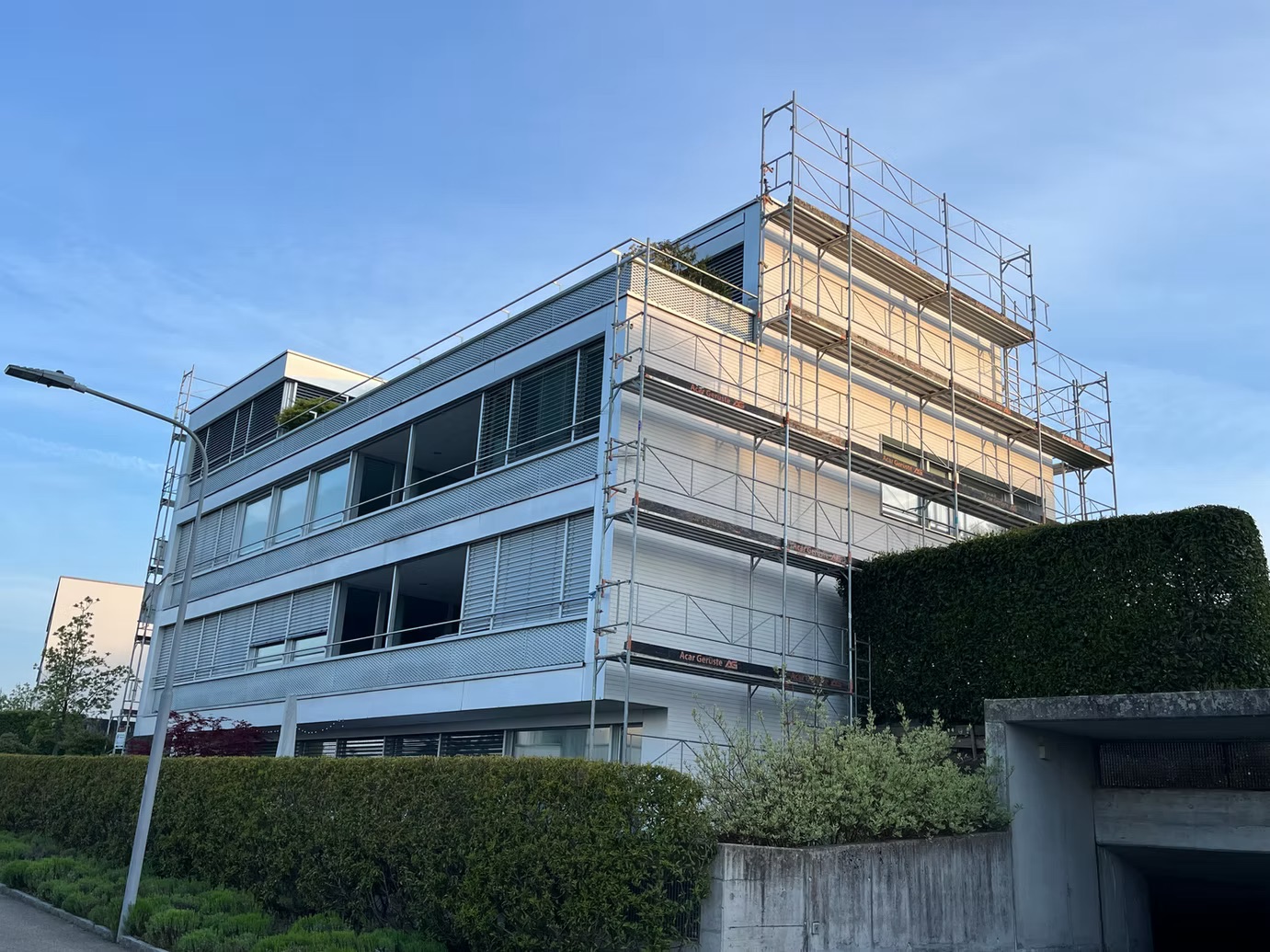 Beim Mehrfamilienhaus an der Haldenbachstrasse erstellen wir derzeit die gesamte Fassade neu. Sämtliche Fassadenflächen werden mit einem hochwertigen Neuanstrich versehen, wodurch ein modernes Erscheinungsbild und ein langfristiger Werterhalt gesichert werden.