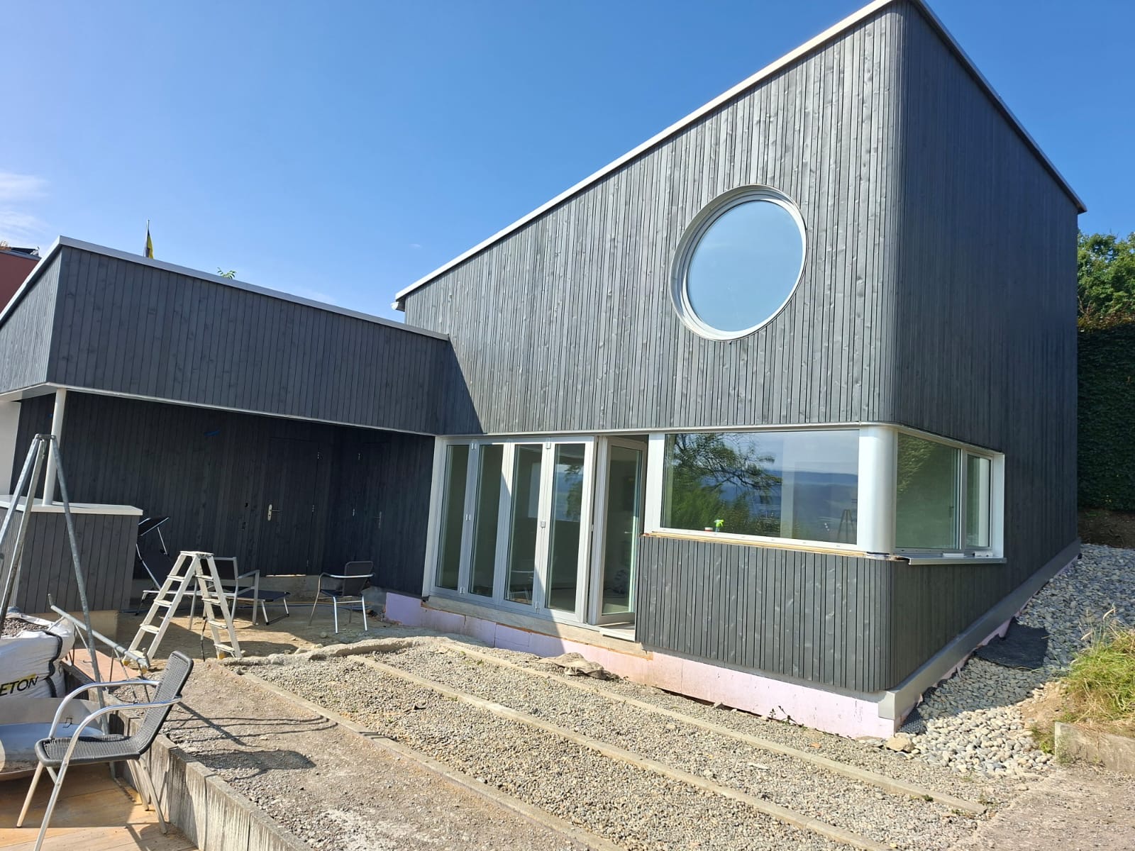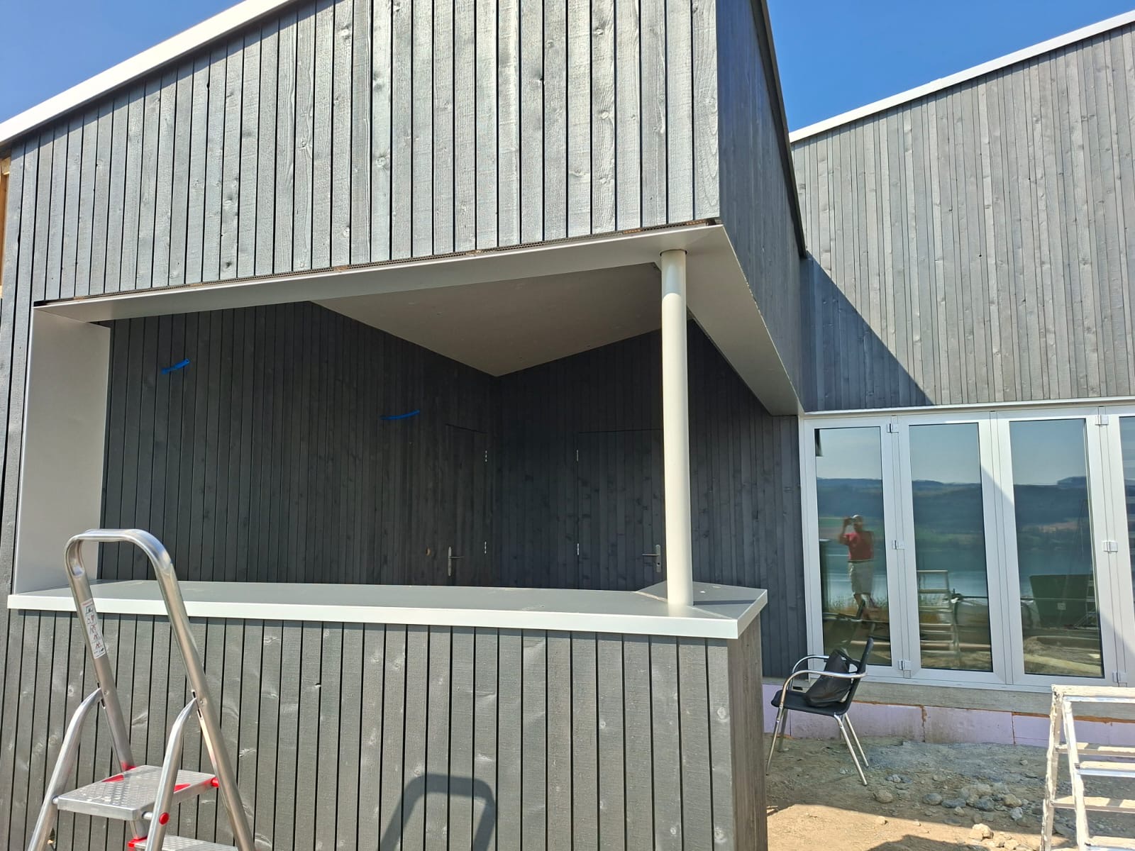 Farb- und Oberflächenberatung im Kontext zu den bestehenden Anlagen. Lasurarbeiten auf allen äusseren Oberflächen.